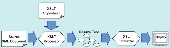 There are two main components in XSLT that helps transformations, XSLT Processor and XSL Formatter. First, the XSLT processor takes two inputs, a XML document and a XSLT stylesheet. The XSLT processor starts from the root node and then it goes for the root node's children. The processor searches the stylesheet element to see if any template element and other XSLT elements are defined. As per the defined XSLT rules it fetches data from the XML document and generates a results tree in XML format. The XML formatter takes input as a result tree and generates the final end products as HTML, text other XML format.