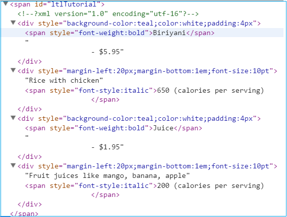 Here I added a Label control to display the generated HTML content that is generated from XML data. The following code can be used to transform XML data from an XML file (tutorial.xml) using the XSLT file(tutorial.xslt).