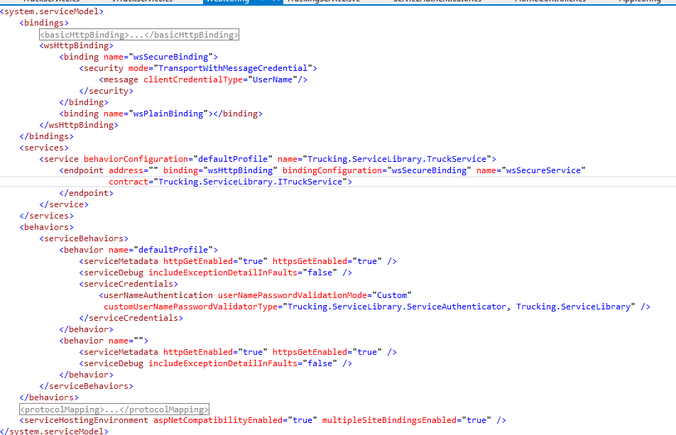 Then we need to configure the web.config for the service binding, security mode and username/password authentication.