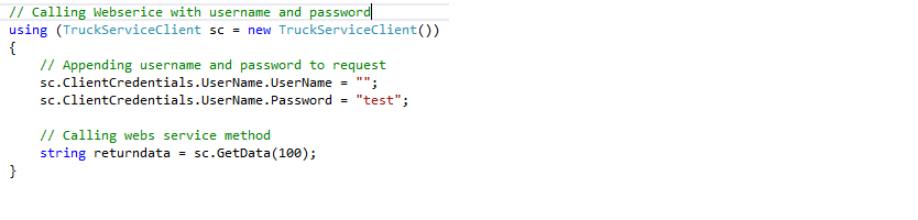 Next go to the webform code-behind file and try to call the WCF service method. Please see the following screenshot to call the service by passing a username and password. Here I am passing a Username and Password and the WCF service will validate those using the ServiceAuthenticator class.
