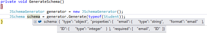 In the following code we are creating object of JSchemaGenerator class and calls Generate() with passing Student type object. It returns JSchema object type.