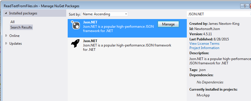 In Visual Studio, Tools menu -> Manage Nuget Package Manger Solution and type “JSON.NET” to search it online. Here's the figure: