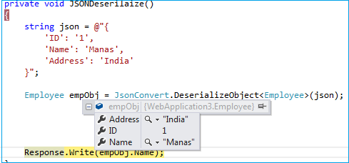 - Employee empObj = JsonConvert.DeserializeObject<Employee>(json);