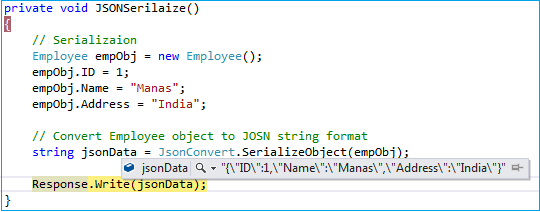 Now create an object of Employee class and assign required value to its properties. Then call SerializeObject() of JsonConvert class with passing Employee object – it returns JSON format text. Here is the code: