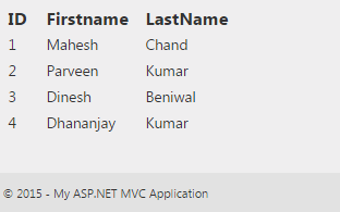 Suppose you need to load partially a webpage on demand and that needs to implement only couple of pages. Then how we will achieve this in MVC? So this article helps you to implement the same through sending PartialView using jQuery AJAX concept. Here I am taking an example as to display top members with ID, FirstName, LastName in view.