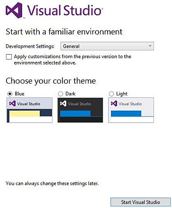 Now I am just one step away from starting to use my Visual Studio 2015, choose the development settings and color them based on what you like most for your platform and BTW everything can be customized later.