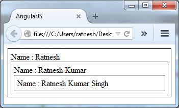 In the following example we have created three controllers with ng-controller. The BaseController has one child, ChildController, and it has a child controller SuperChildController. We have set the first name, middle name and last name in the scope of these controllers respectively and attempt to get the value in each of the controller's views. We can see that the $scope that each Controller can access is the properties defined by its own Controller and the Controllers higher up the hierarchy.