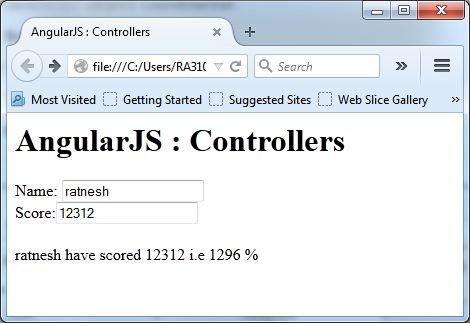 Now we are trying to build an application that takes the input form user as name and score and calculates the percentage for the score out of 950 and displays the message. Here we have defined a controller as “CalulateController” that takes the argument $scope. The ng-model directives bind the input fields to the controller properties (name and score). The property percent is the function of the current $scope object that returns the percentage.