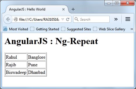 “ng-repeat” is also a very common directive. It is used to repeat an HTML element. In the following lines of code we are repeating the “<tr>” for each item in the model called “friends”.