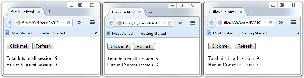 I have opened three instance of the page in the browser. I clicked the “Click me!” button thrice on each page. Then I clicked “Refresh” on each page. In the screen grab we can see that session hits count is three for each instance and the total hits is 9. So we can see that localStorage is common for all but sessionStorage is independent of each other.
