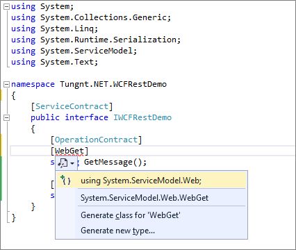 - To use the WCF service as REST return JSON data we need to change the service interface's methods that has attributes to use WebGet (GET data only) or WebInvoke (for GET/POST/PUT/DELETE data) as in the following. (Note: These attributes are members of System.ServiceModel.Web.dll so we need to add this reference before use).