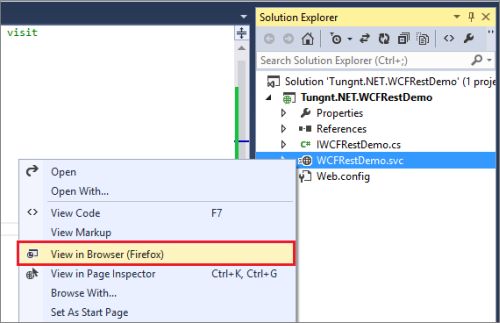 The WCF REST service is ready to be used, let's check the WCF REST service to ensure it can be used right now. Right-click on the WCFRestDemo.svc file and select View In Browser as in the following: