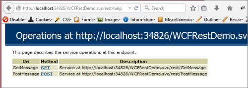 - Click the service help page (as configured helpEnabled = true in web.config above) to see the rest of the methods in this service.