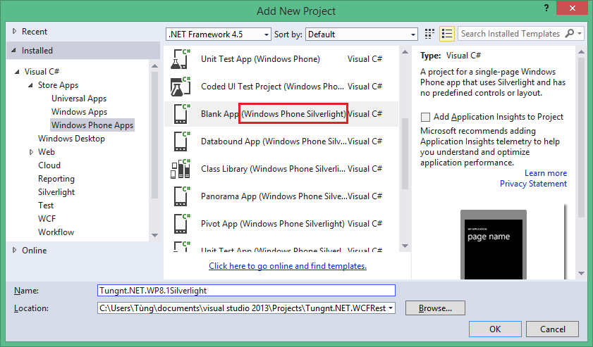 Step 1: In the solution (created in the previous article) we added a blank Windows Phone 8.1 Silverlight app named WCFRESTDemo as shown below: