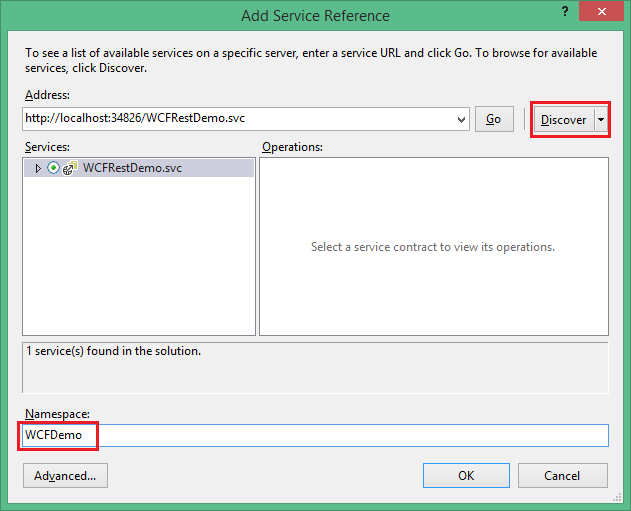 Discover to find the service in the solution. I'll see WCFRestDemo service, named it is WCFDemo and click OK.