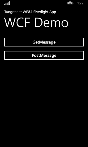 Step 4: After 3 steps above we have finished preparing the WCF Service for use. Next, we need to design the interface of Windows Phone application to call the functions in this service. The WCF Service only has two simple functions, so we will design the UI with two buttons and rename App name and Page name on MainPage.xaml as in the following: