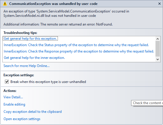 Click on the button GetMessage. We will see a CommunicationException instead of a message returned from WCF Service as in the following: