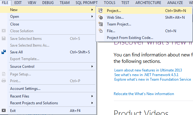 Step 1: Open Visual Studio 2013 then seelct "File" -> "New" -> "Project..." as in the following: