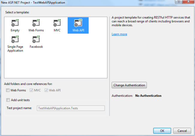Step 3: Select the location and enter the project name. Click OK. Select WebAPI from the template.
