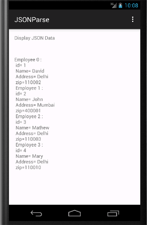 - String strJson = "{\"Employee\" :[ {" + " \"id\":\"1\",\n" + "\"name\":\"David\",\n" + "\"address\":\"Delhi\", \n" + "\"zip\":\"110002\"}, {\n" + "\"id\":\"2\",\n" + "\"name\":\"John\",\n" + "\"address\":\"Mumbai\",\n" + "\"zip\":\"400001\"}, {\n" + "\"id\":\"3\",\n" + "\"name\":\"Mathew\",\n" + "\"address\":\"Delhi\",\n" + "\"zip\":\"110003\"}, {\n" + "\"id\":\"4\",\n" + "\"name\":\"Mary\",\n" + "\"address\":\"Delhi\",\n" + "\"zip\":\"110010\"} \n" + "]}";