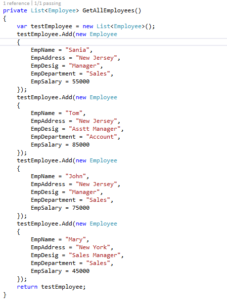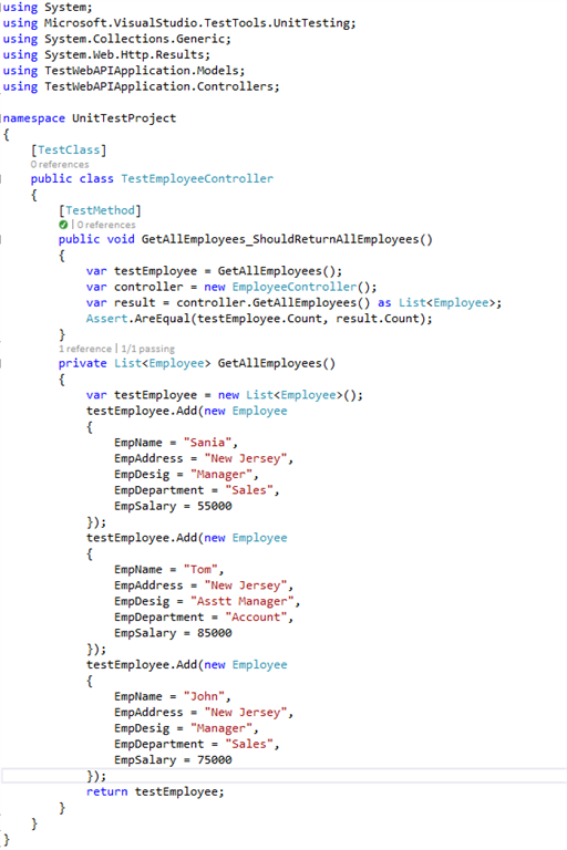 Add a new class called TestEmployeeController.cs to the UnitTestProject project and implement a method. Build the solution.