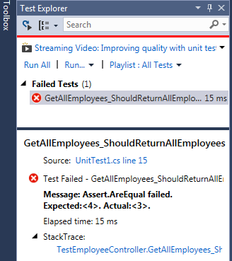 Now the expected result is 4 but the actual result is 3. So the test failed.