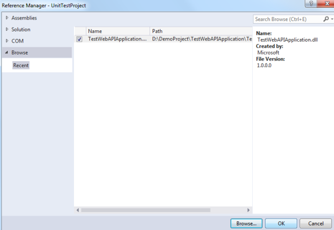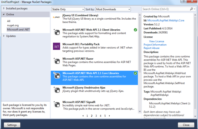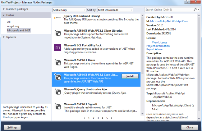 The Microsoft ASP.NET Web API 2.1 Core libraries will be installed in the UnitTestProject project.