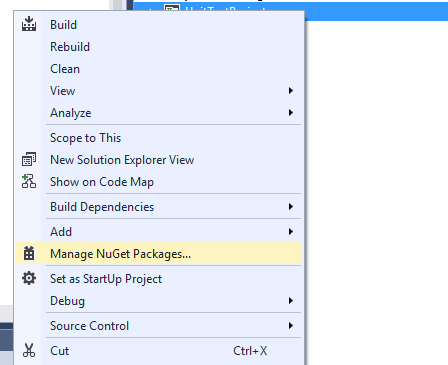 Right-click the UnitTestProject project and select Manage NuGet Packages as in the following: