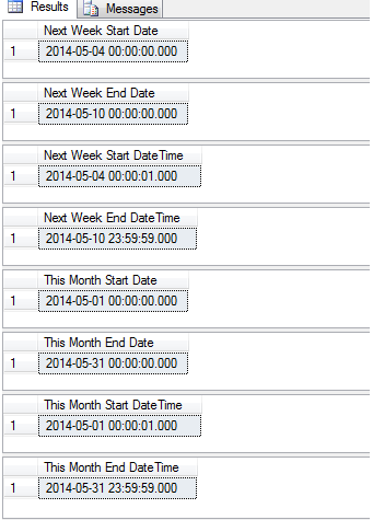 SELECT DATEADD(s,1, DATEADD(mm, DATEDIFF(mm, 0, GETUTCDATE())+1, 0)) 'Next Month Start DateTime'