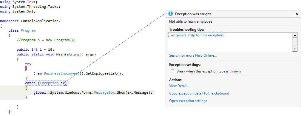 Now if you run the code above by putting it into the respective layer then when exception is thrown by the actual code debugger break execution in the front layer code. The following image shows that.