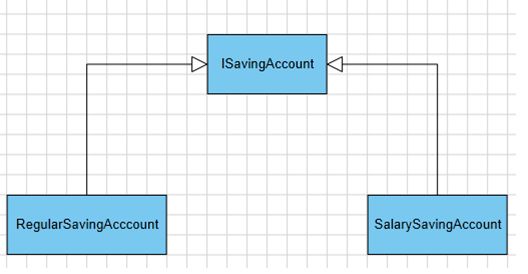 In the preceding code two new classes are created, RgularSavingAccount and SalarySavingAccount, that is inherited from IsavingAccount.