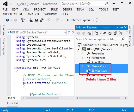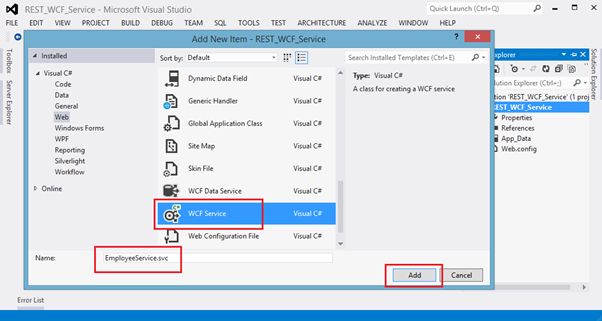 Now right-click on the project in the Solution Explorer then select "Add New Item" then select "WCF Service" then name it "EmployeeService".