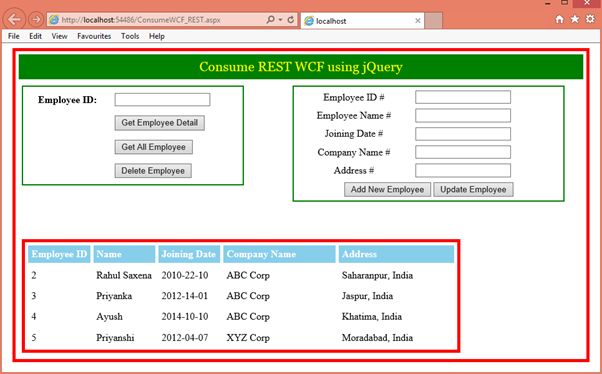 - <td style="background-color: green; color: yellow; height: 30px; font-size: 16pt; font-family: Georgia; text-align: center;" colspan="2">Consume REST WCF using jQuery</td>