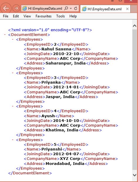 - XDocument doc = XDocument.Load("H:\\EmployeeData.xml");