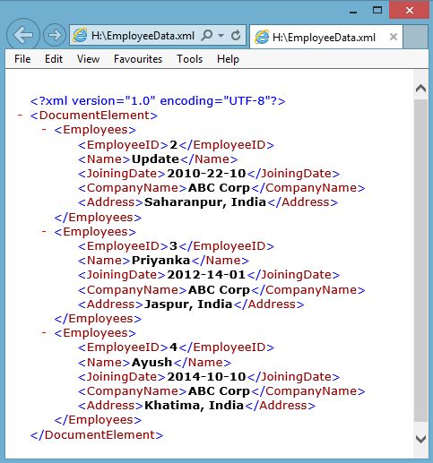 - XDocument doc = XDocument.Load("H:\\EmployeeData.xml");