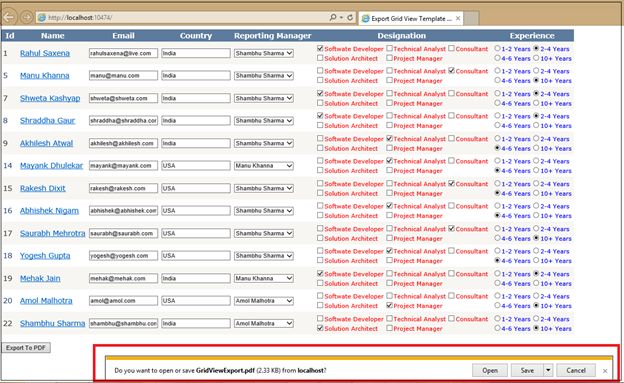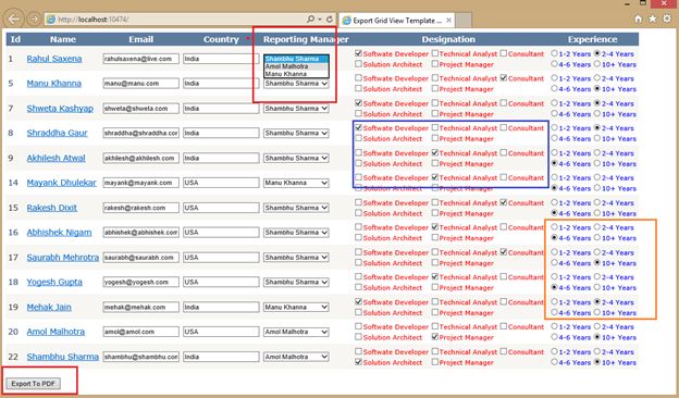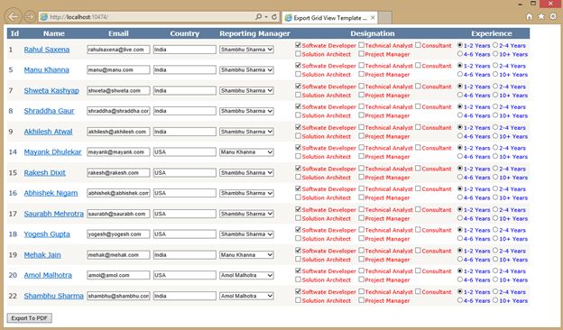 We can have any type of column in a Grid View by using a Template column like Link, Drop Down, Radio button and check box list. So how to export all those into a PDF file? We will learn how to do that here.