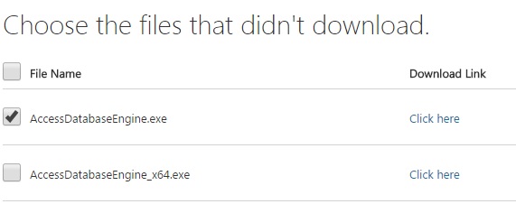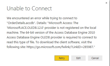 You might the error message shown in Figure 4 if you don’t have the Microsoft Access 64-bit service pack. Go through with this link to install Service Pack 1 and redistributable. https://go.microsoft.com/fwlink/?LinkID=285987