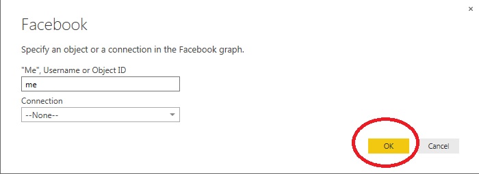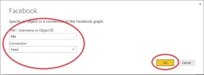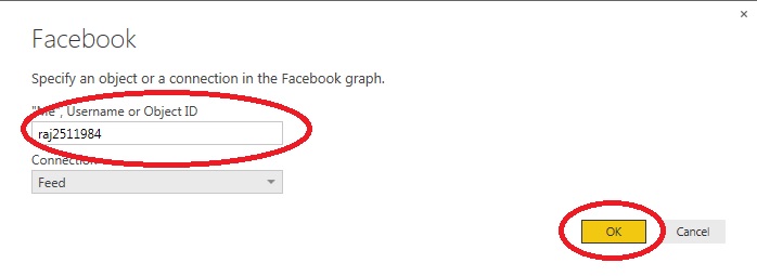 Now provide Facebook username or object id or connection and click OK.