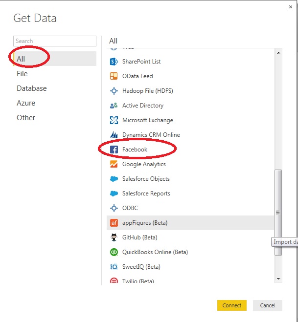 Select all from the left side and select Facebook and click Connect button.
