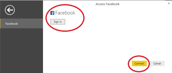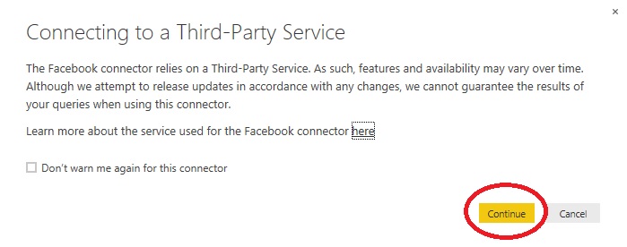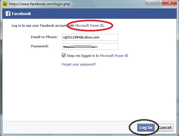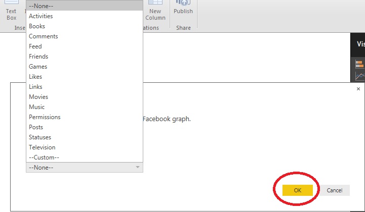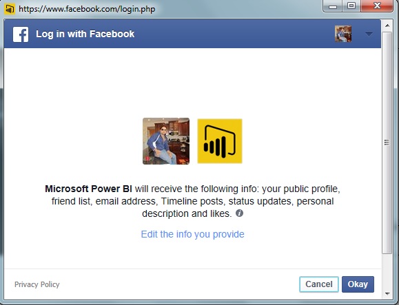 Power BI needs to access your Facebook public details like profile, friend list, email address, Timeline posts, status updates, personal description and likes and click Okay button.