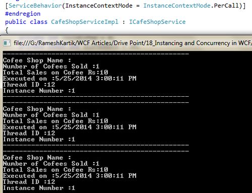 In the attached source code, if you see the service interface method the iInstanceCount will be used. It is just used to hold the number of times this method has been executed. As I said earlier, the PerCall actually creates one server instance per method call, so the information will not be retained on the server. In our case the iInstanceCount will be incremented on, every method call from the client proxy and will be disposed of after the method call. And the following snapshot is the output of the program.