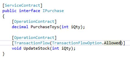 The service operation allows the transaction propagation if the client wants to. That is, the client creates the transaction, the binding that you are using also supports transactions. If the transaction flow option is allowed in the service method then the transaction will be propagated to the service. In other words the transaction will not be Propagated. What if, when the client propagates the transaction, the binding in the service does not support transactions? As a result an exception will be thrown when the client propagates the transaction.