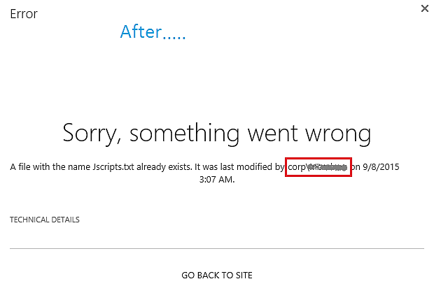 When we upload the existing document in the Document Library by unchecking the override existing file we get SharePoint OOTB exception saying ”A file with the same name already exists and it was last modified by i:o#.w|domain\username.”