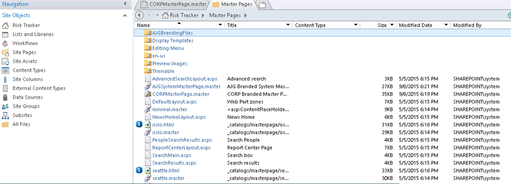 Step 1: Open the site collection in browser. Go to SiteSettings, MasterPage and then check the selected Site Master Page and System Master Page.