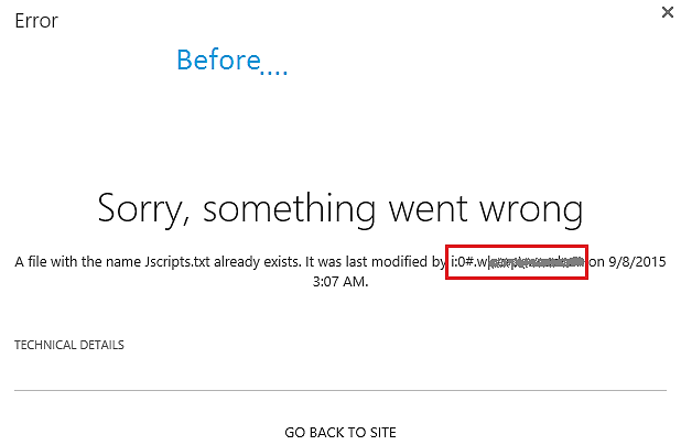 When we upload the existing document in the Document Library by unchecking the override existing file,we get a SharePoint OOTB exception saying "A file with the same name already exists and it was last modified by i:o#.w|domain\username."