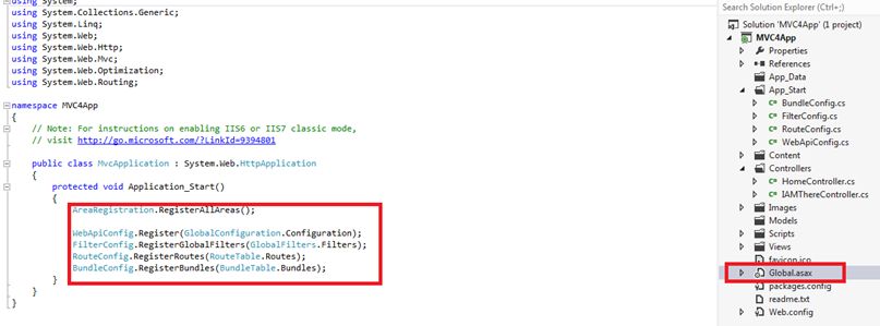 Its showing routing data gets filled up in App_start event that exists in Global.asax file. The important method is “RegisterRoutes”.