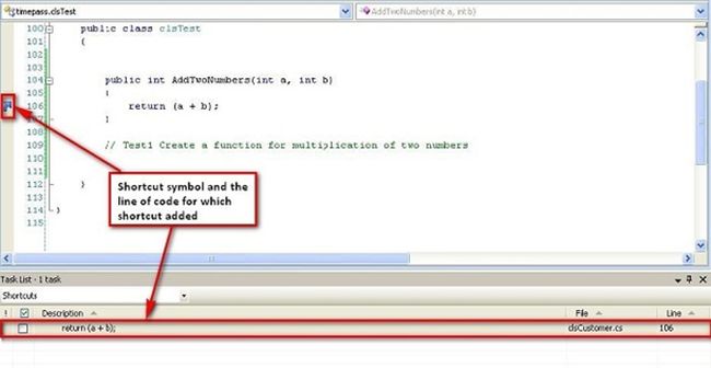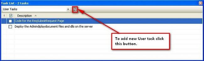 To view the Task List window, select the Task List entry as shown in Fig 1.Figure 1: How to open Task List windowAll the three tasks are listed in the dropdown of the Task List window (Fig 2).Figure 2: Task List window with category list1. CommentsComments are the tasks that we want to do in the code. Suppose we want to create a function that returns the addition of two integers. And this task remains uncompleted because of some other task. We can add a comment using TODO and later do this task. (As given in Fig 3):Figure 3: Comments Task List window with TODO commentHere TODO is nothing but an identifier and any comment that starts with TODO is listed in the Comment window of the Task List. TODO is one of the identifiers that is in Visual Studio by default. We can create an identifier of our own. Click "Tools" -> "Options". In the Options dialog, select "Environment" -> "Task List". Enter the name of the identifier in the name box and click add. We can set the priority of an identifier by selecting the priority dropdown list.Figure 4: How to add user defined identifierAfter creating the Test1 identifier, we can use it in our code as shown in Fig 5. It is added in the comments Task List window. If we double-click the comments task, we can jump to the line of code where we place the comment.Figure 5: User defined identifier example in Comments2. ShortcutsShortcut tasks are nothing but links to the line of code within the project. They are similar to bookmarks. We can jump to the line of code by clicking the shortcut task of the Task List window.To add a shortcut task, just click Ctrl+E, T or go to "Edit" -> "Bookmarks" then click the "Add Task List" shortcut.When we complete a specific shortcut task, we just check the checkbox associated with the task. This is only for our information.Figure 6: Shortcut symbol and Shortcut window3. User TasksUser Tasks are the tasks that the user wants to do. It's either personal or project related that he/she wants to list. The User Tasks are directly entered in the Task List window. We need to click a button near the category dropdown list to add a new User Task as shown in Figure 6.If we completed a specific User Task, just check the checkbox associated with the task.Figure 7: User Tasks windowSummaryThis article is for entry-level programmers who are unfamiliar with the Task List feature of the Visual Studio .NET Framework.