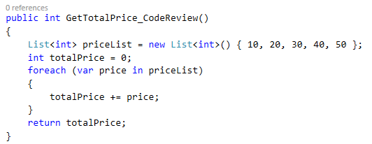 After Code Review: Loop through list of prices, add each price to total, and return. |