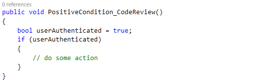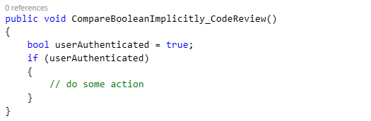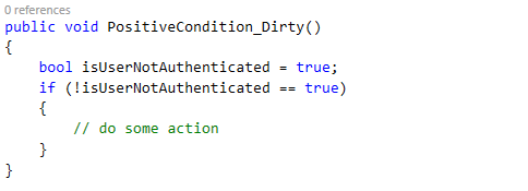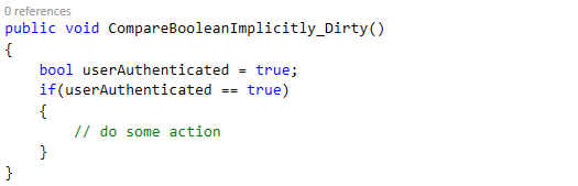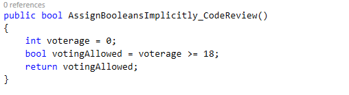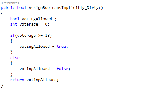 One of our primary goals when writing clean code is to increase the signal to noise. To increase the signal to noise a Boolean should be assigned implicitly as well. There’s a number of clear advantages to this more implicit style of assignment.
