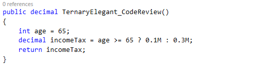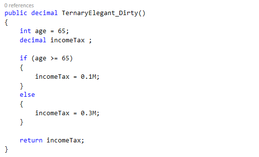 But, there's still clear room for improvement because the signal to noise can be significantly increased by utilizing the Ternary operator instead. This approach has many of the same benefits as the implicit Boolean assignment that we just discussed.